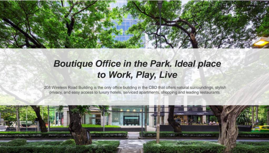 อาคาร 208 ถนนวิทยุ อาคารสำนักงาน 34 ชั้น ตั้งอยู่ ติดกับถนนวิทยุ ใกล้รถไฟฟ้า BTS เพลินจิต พื้นที่สำนักงานเริ่มต้น ตั้งแต่ขนาด 100 ตารางเมตร ไปจนถึง พื้นที่ Whole floor 1,550 ตารางเมตร เป็นอาคารสำนักงานขนาดใหญ่ พื้นที่ส่งมอบมาพร้อม ฝ้า ผนัง และ พื้นปูน สามารถบริหาร จัดการ ออกแบบ จัดสรร และ ตกแต่ง ได้ตามความต้องการ ตามนโยบาย ของแต่ละบริษัท รวมไปถึง บางพื้นที่ จะมีการตกแต่งจากผู้เช่าเดิม มีทั้ง Fully-Furnished และ Partly-Furnished พื้นที่สำนักงาน มีความไพรเวท ความเป็นส่วนตัว ภายในพื้นที่ของบริษัท ภายในชั้นสำนักงาน มีห้องน้ำ แยกชาย-หญิง มีระบบรักษาความปลอดภัย Keycard และ เจ้าหน้าที่รักษาความปลอดภัย รวมไปถึงระบบกล้องวงจรปิด ลิฟท์โดยสาร ทั้งหมด 10 ตัว แบ่งเป็น Low zone 5 ตัว, และ High Zone 5 ตัว